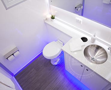 Luxury bathroom trailer has all the basic features, alongside additional decorations and high-end accessories.