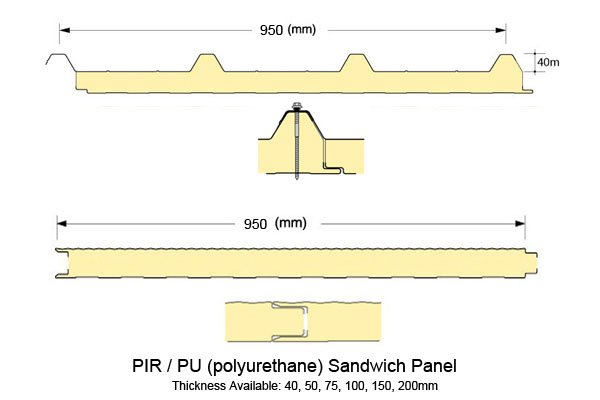 The steel of PU sandwich panel, be PPGI or galvalume steel 0.4-0.8mm. The density of PU sandwich panel ranges between 38-45 kg/m3. The thickness of PU sandwich panel ranges between 40-200mm. The width of PU sandwich panel is 1000 mm. The length of PU sandwich panel has no limit, can be cut to size as per your project needs, one order could include dozens of hundreds of lengths, but restricted by sea container 40HQ maximum length 11.85m.