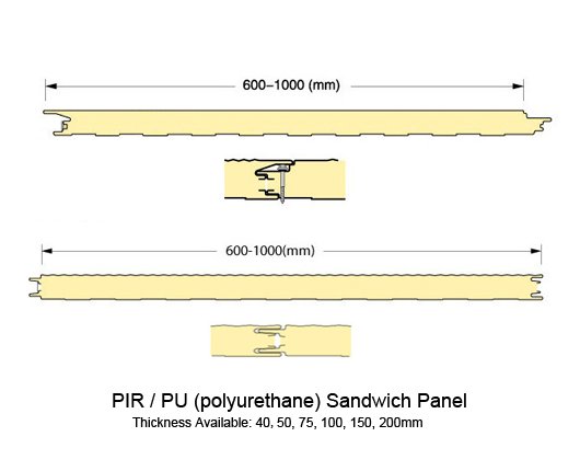 Steel skin of sandwich panel 0.4-0.8mm, pre-painted galvanized steel or pre-painted galvalume steel. Sandwich panel thickness ranges from 40 to 200mm. Width 1000 or 1200mm. Length maximum 1185mm limited by sea container, if you use bulk cargo ship, then whatever length is possible.